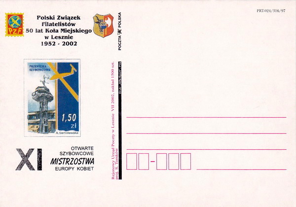 Dla tego okrągłego jubileuszu 50-lecia Koła PZF w Lesznie przygotowano 20 kartek pocztowych z czego 7 sztuk to kartki upamiętniające przesyłki szybowcowe, przedstawiające reprodukcje różnych nalepek z organizowanych przez Koło imprez-lotów towarzyszących wielkim zawodom lotniczym organizowanym w Lesznie na przestrzeni 50-ciu lat, nakład 1500 szt., były też kartki upamiętniające: poczty balonowe, wystawy filatelistyczne, zjazd filatelistów czy bardzo ciekawa kartka opisująca wydarzenie jakim było wydanie "Katalogu Sygnet na Ziemiach Polskich od 1772 roku" pod redakcją Jana Zaborowskiego z Warszawy i redakcją techniczną Władysława Ługowskiego z Leszna. Bardzo ciekawe opracowanie dla zbieraczy walorow revenue i nie tylko.